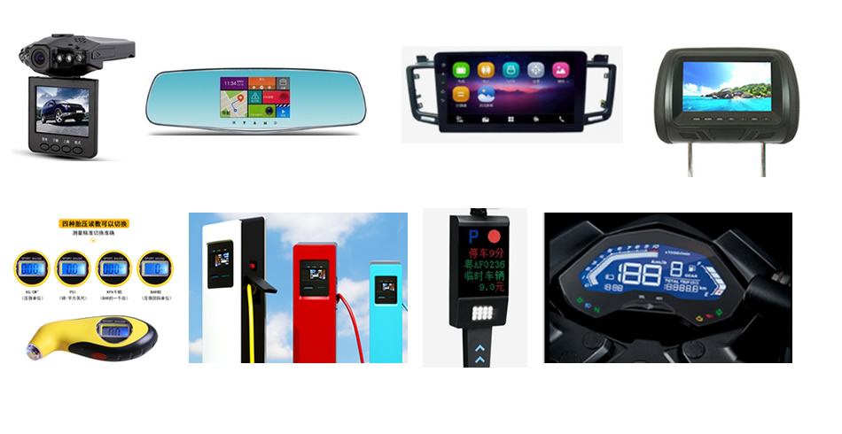 示、行李安全系统,汽车充电桩、汽车闸机、无人驾驶,无人机等汽车电子显示屏, 摩托车仪表显示屏。